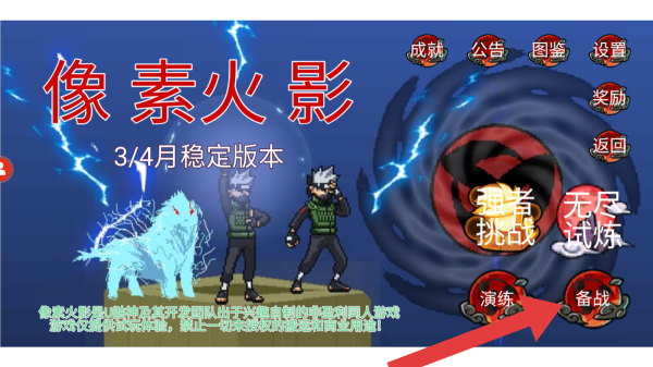 2、画面中有卡卡西等火影角色,还有“强者挑战”“无尽试炼”“演练”“备战”等功能按钮,点击【备战】能够与敌人进行战斗。
