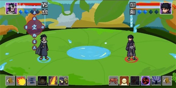 3、左侧是一名宇智波佐助的角色,右侧是佩恩天道的角色,画面下方有技能图标、方向控制按钮,点击攻击模式进行攻击敌人。