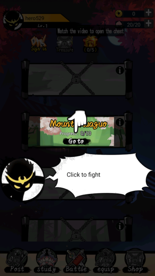 1、上方有“Watchthevideotoopenthechest”,底部有“Post、study、Battle、equip、Shop”等功能按钮,是有角色养成、战斗闯关等玩法。