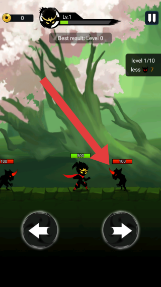 2、画面中主角是一名黑色忍者形象角色,等级为Lv.1,正在与敌人战斗,敌人也是黑影忍者形象,上方显示最佳结果等级,当前关卡是1/10,剩余敌人数量为7。