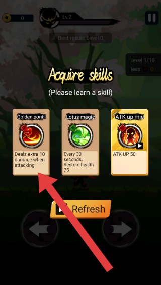 3、“Refresh”(刷新,可观看广告刷新技能),下方有左右移动控制键,通过学习技能增强角色战斗能力的玩法。