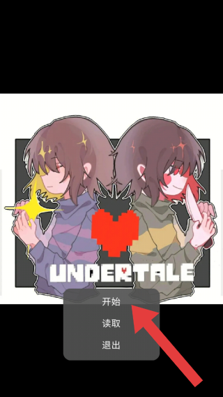 1、这是(UNDERTALE)的启动界面,界面中有两个卡通风格人物形象,下方提供操作选项,点击【开始】方可进入。