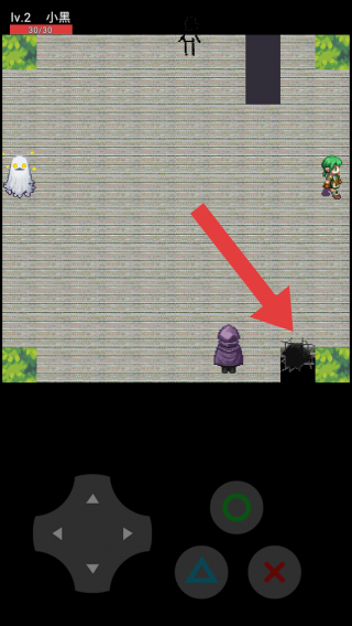 2、画面中显示角色昵称是“小黑”,等级为Lv2,有血量显示,场景里有幽灵、持剑绿发角色等,下方是方向键和功能按键。