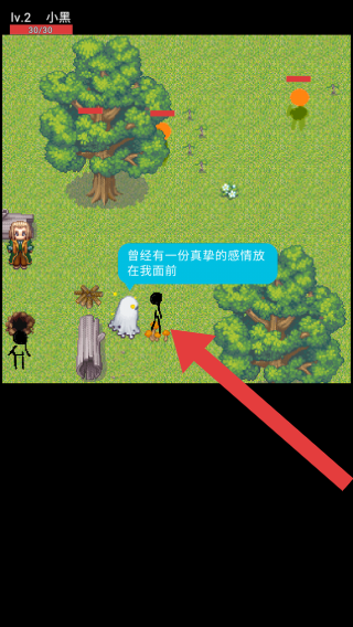 3、场景中有草地、树木、NPC(如左侧人物)、火柴人形象角色等,其中火柴人角色有对话“曾经有一份真挚的感情放在我面前”。