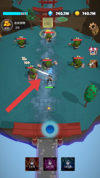 3、角色等级Lv.1,金币、钻石数量740.7M,任务“击杀怪物2/3”,场景中有持武器的角色与多个绿色怪物,下方有技能栏,呈现战斗闯关情境。