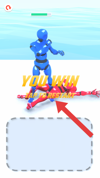 3、蓝色机甲角色获胜(YOUWIN),红色机甲角色倒地,提示【TAPTORESTART】(点击重新开始),呈现出战斗胜利后的场景。
