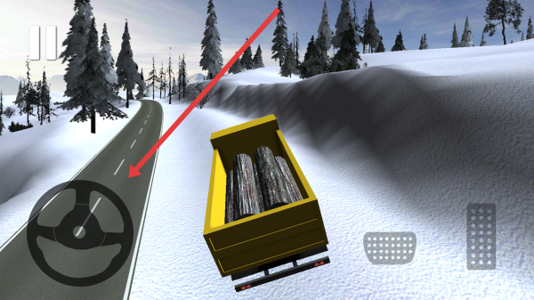 3、在雪地驾驶界面,通过左侧方向盘、右侧踏板,控制卡车运输木材,沿道路行驶,完成Level1运输任务。