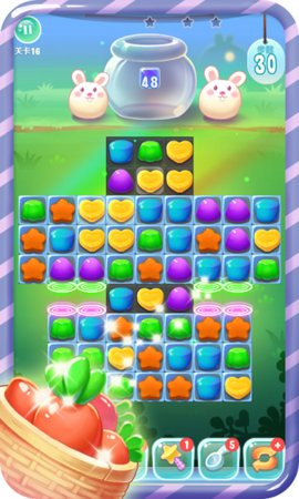 2、道具收集网络:关卡中分布多种功能道具,炸弹道具消除指定区域果冻,彩虹糖道具消除特定颜色果冻,时间道具延长关卡时间,合理规划道具使用顺序提升闯关效率。