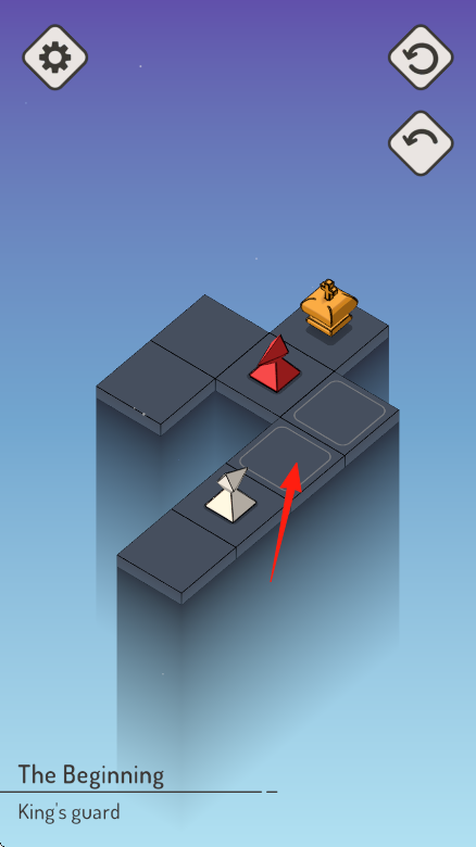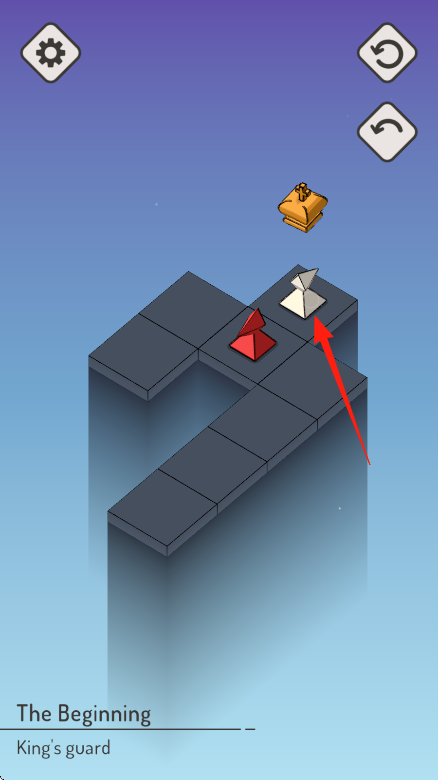 2、进入“King'sguard”关卡,操控白色棋子(箭头指向),绕开红色卫兵棋子,向目标格推进。