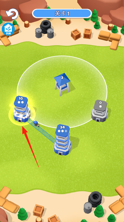 3、夺取新蓝色塔楼(箭头指向)后,调度其兵力,攻击敌方灰色塔楼,完成关卡占领任务。