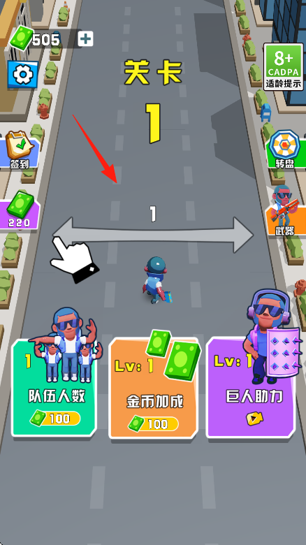 1、在关卡1界面,按需选择“队伍人数”“金币加成”等增益(如点队伍人数提升战力),点击箭头指向区域,进入战斗。