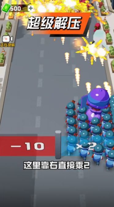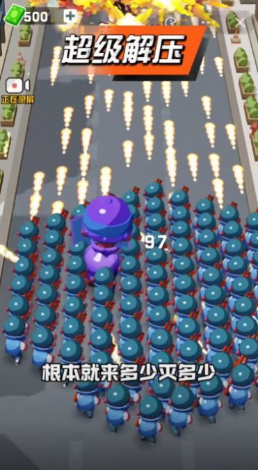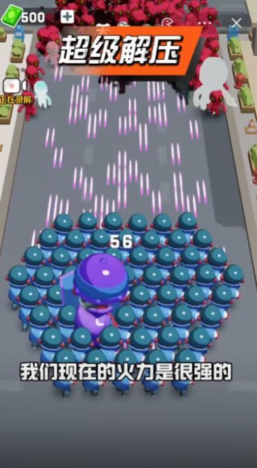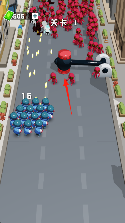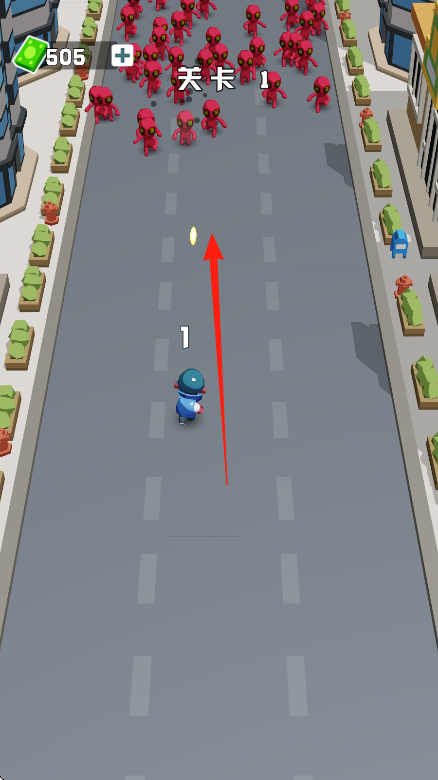 2、操控角色沿道路(箭头指向)前行,遭遇红色怪物群,自动射击,推进关卡。