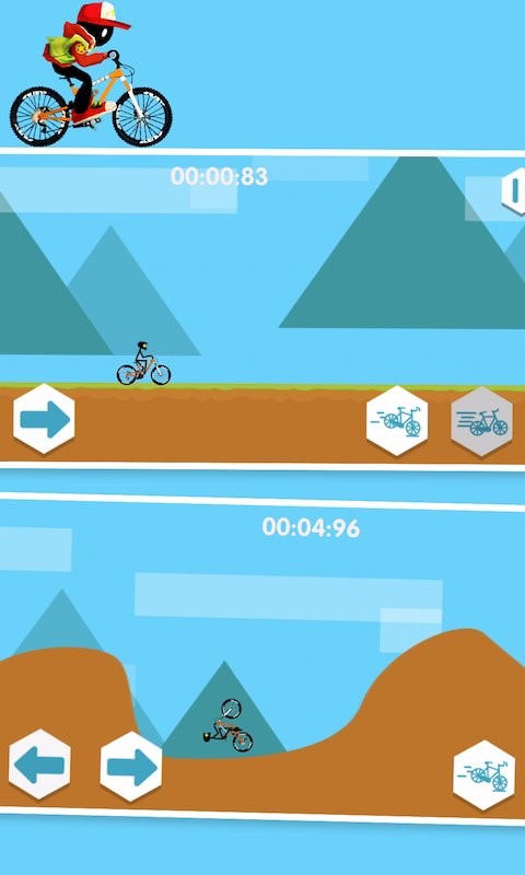3、简约视觉风格:以经典火柴人为主角,搭配色彩鲜明的单车与赛道元素,既保持简约特点又能让玩家清晰识别障碍与路线。