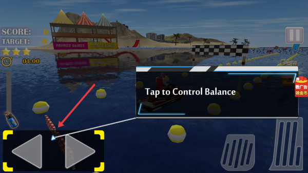 2、行驶时,按提示点击控平衡,用左右按键调方向,避障碍,沿水路冲,留意时间。