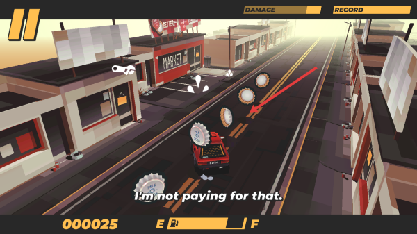 2、行驶时,用两侧箭头把控方向,避让岩石、建筑等障碍,沿公路冲刺,同时留意顶部油量、损伤值状态。