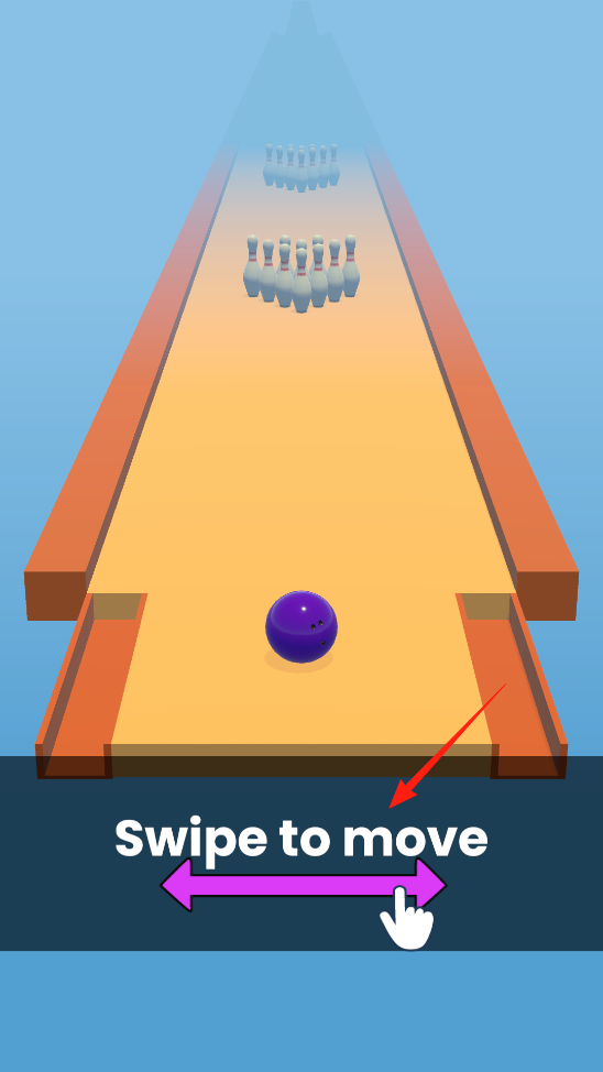 1、进入保龄球游戏界面,按“Swipe to move”提示,滑动屏幕调整紫色保龄球位置,借滑动操作,精准控制球的初始摆放,为击打瓶阵做准备,体验基础的击球前置策略。