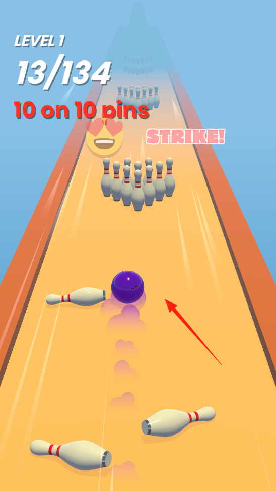 2、滑动保龄球出发后,观察其滚动轨迹,撞击球瓶,借物理碰撞机制,看球瓶被击倒的数量,达成“STRIKE”等成就,感受一击全倒的爽快感,推进关卡进度。