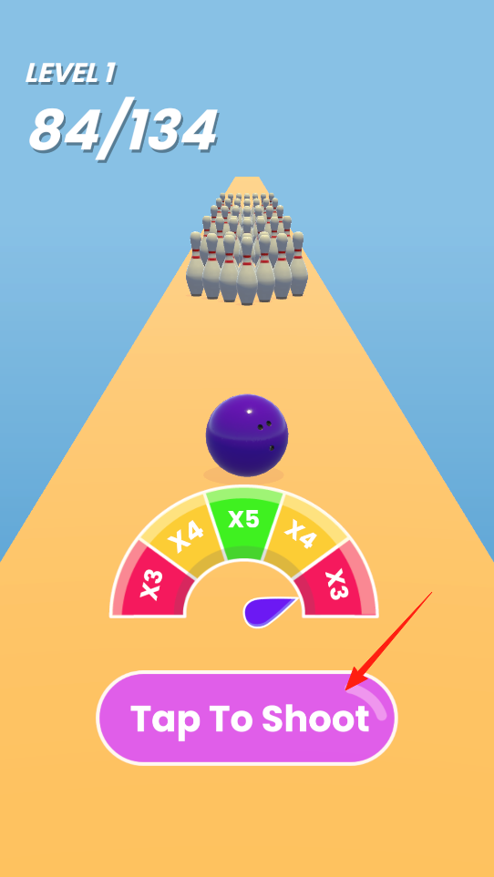 3、球滚动中,出现增益仪表盘,点击“Tap To Shoot”触发强化,借增益触发机制,提升击球效果(如×5倍数),应对更多球瓶挑战,体验策略性强化与高难度关卡的结合。