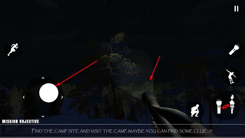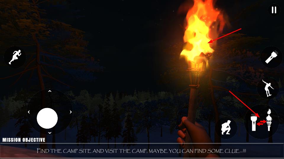 2、进入游戏场景,用左侧摇杆控制移动,借助右侧动作按键,如切换手电筒、火炬,探索黑暗森林。