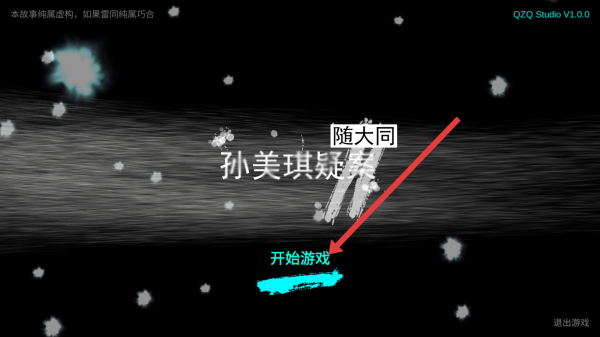 1、在游戏启动页,点击【开始游戏】,进入《孙美琪疑案:随大同》,开启悬疑解谜冒险,留意“故事纯属虚构”提示。