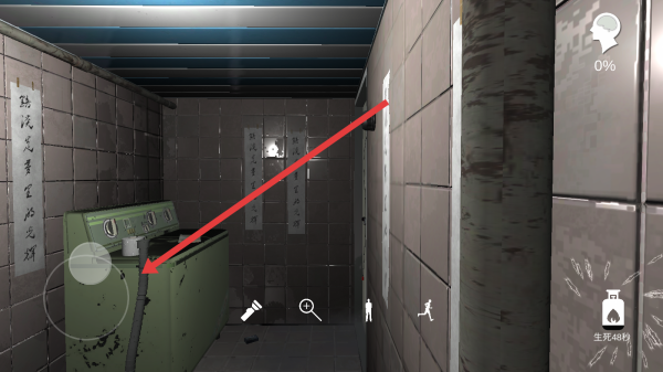 2、进入场景(昏暗房间),可以移动视角,靠近绿色洗衣机,探索周边环境,寻找线索,触发解谜流程。