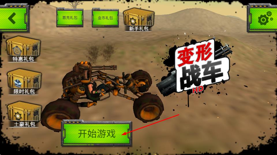 1、进入游戏界面,可查看首充礼包、金币礼包等福利,点击“开始游戏”,驾驶战车开启冒险。