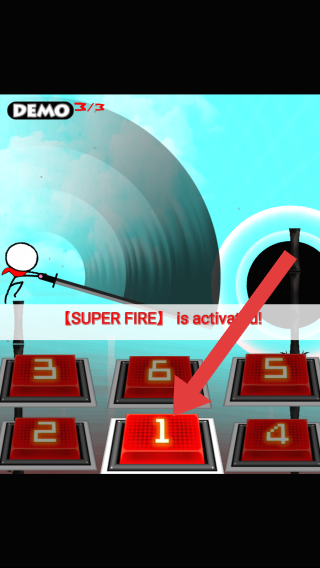 3、处于DEMO3/3阶段,显示“【SUPERFIRE】isactivated!”(超级火焰已激活),画面中有带数字的红色按钮,火柴人角色持武器,呈现出动作格斗的场景。