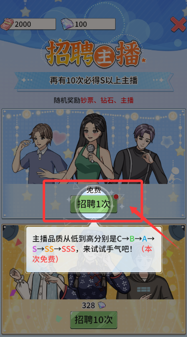 2、跳转至人才招募界面,选择"免费招募"选项,完成首次主播选拔工作。
