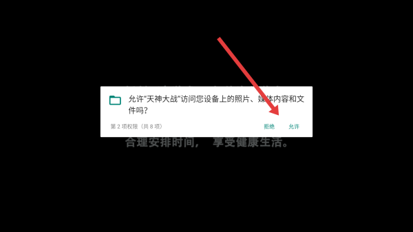1、首次启动游戏,遇到权限申请弹窗,按需选择【拒绝】或【允许】“天神大战”访问设备照片、媒体和文件,进入游戏。
