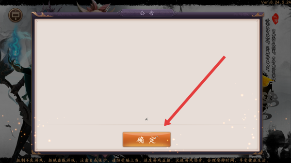 2、若有公告,在进入公告界面后,阅读内容(当前无文字),通过点击【确定】关闭弹窗,继续游戏体验。