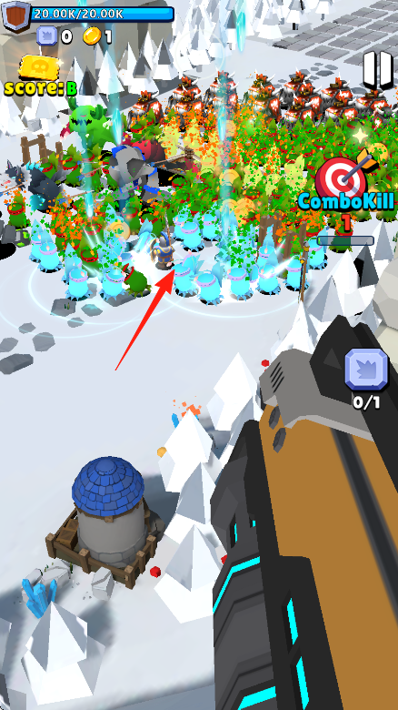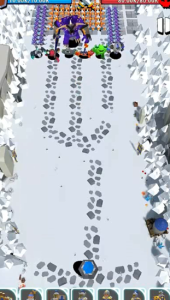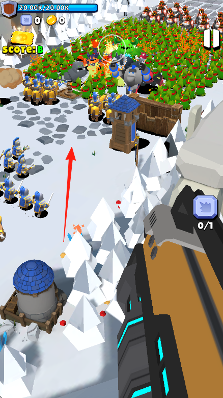 2、操控蓝色士兵部队(箭头指向),沿雪地路径前进,对抗绿色怪物群。