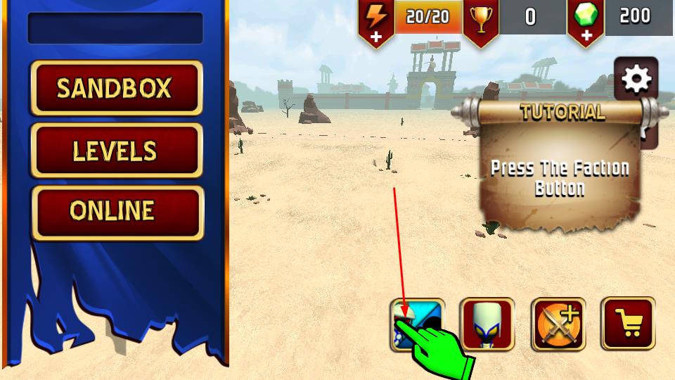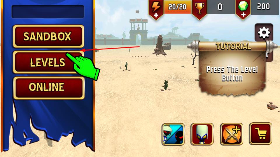 1、在关卡选择界面,点击“LEVELS”进入战斗关卡,也可选“SANDBOX”“ONLINE”模式体验。