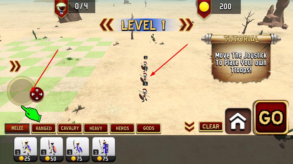 2、进入战斗场景(如 Level 1 沙漠地形),通过摇杆放置部队,利用“MELEE”等兵种栏部署单位。