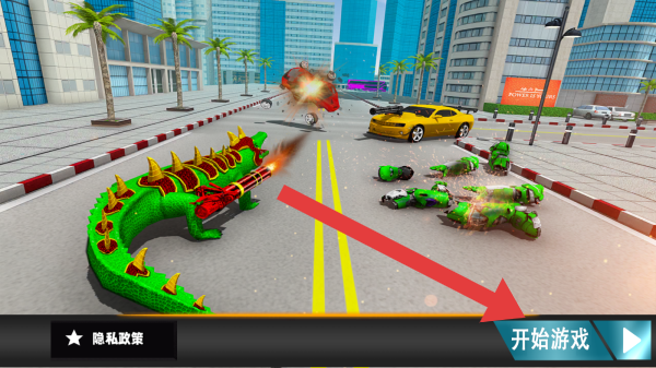 1、画面中的机甲鳄鱼、汽车、机器人等战斗元素,“开始游戏”按钮,呈现可点击开始游玩的初始场景。
