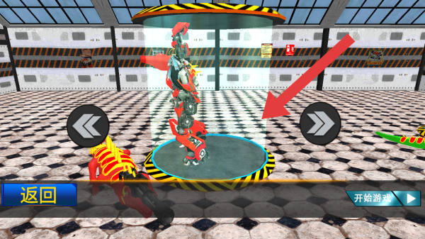 2、机甲(红色机甲形态)、左右切换按钮(用于选择不同机甲)、“返回”和“开始游戏”功能按钮,呈现挑选机甲准备开始游玩的场景。