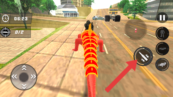 3、操控的红色机甲恐龙、时间“06:23”、任务进度“0/2”,以及技能按钮(火箭弹等技能)、移动摇杆、暂停按钮等,呈现执行任务、战斗的场景。