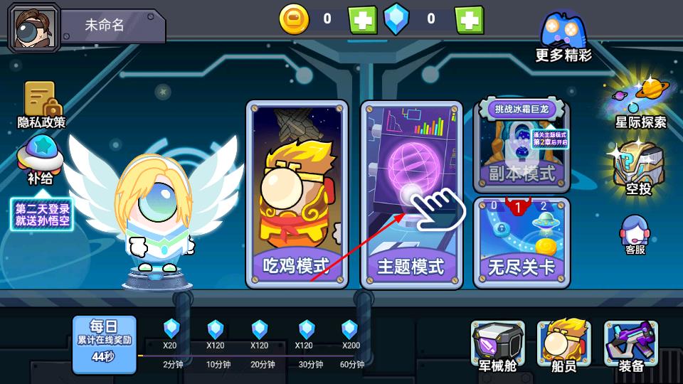 1、主界面选择“主题模式”(或其他模式:吃鸡模式、副本模式、无尽关卡等),可查看“补给”“军械舱”“船员”“装备”等系统,领取在线奖励。