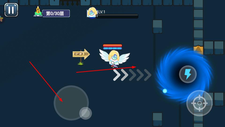 2、进入关卡(如“第0/30层”),通过左侧摇杆控制角色移动,靠近传送门(蓝色漩涡)进入下一层。