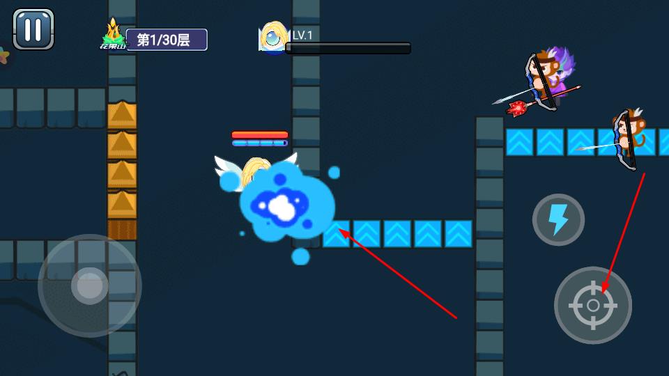 3、战斗层(如“第1/30层”),用右侧射击按键攻击敌人(持弓箭角色),躲避敌方攻击,逐层推进,完成闯关。