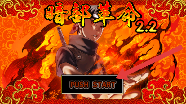1、点击【PUSHSTART】(按下开始,用于启动游戏),画面呈现动漫风格,角色为忍者形象,背景有火焰、中式花纹元素。