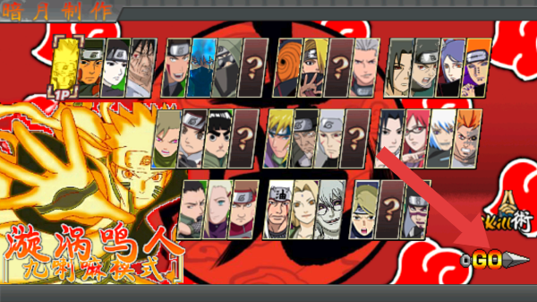 2、包含漩涡鸣人(九尾模式)等火影忍者系列角色,点击【GO】按钮、“kill術”(是技能相关标识),是基于火影IP的同人或粉丝向格斗界面。