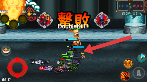 3、画面中有多个火影忍者的角色,处于战斗状态,左下角红色圆形按钮,右下角“A”按钮和技能图标按钮。