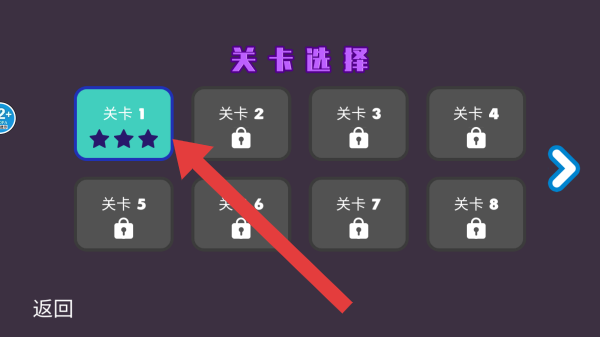 2、“关卡选择”标题,显示“关卡1”已解锁且获三星评价,“关卡2-8”未解锁,左下角有“返回”按钮,右侧有箭头图标,是用于切换关卡页签。