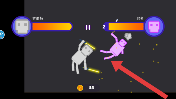 3、战斗状态:罗伯特与忍者正在进行战斗,忍者身上有受击特效,双方的血条,忍者血条旁数字“2”,底部金币数量“55”。