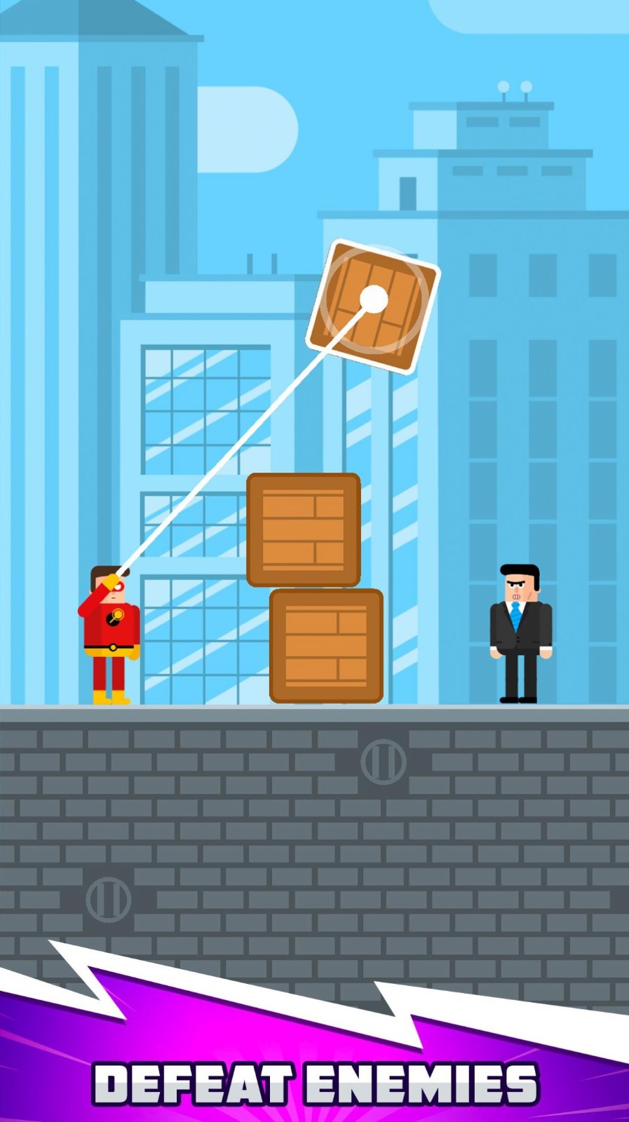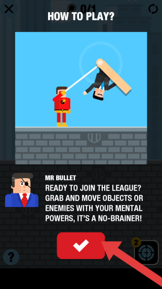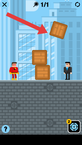 2、画面中红色超人装扮角色应是玩家操控角色,西装角色是敌人,玩家需按箭头指示,使用精神力量操控上方箱子攻击敌人。