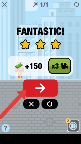 3、色箭头指向的继续关卡按钮、关闭按钮(×)、重新开始按钮(循环箭头),左下角问号帮助按钮、右下角道具图标。