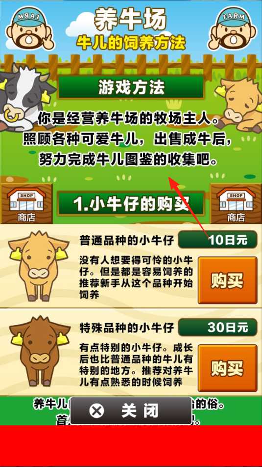 1、作为养牛场主人,先阅读“牛儿的饲养方法”,了解经营逻辑,在商店选购小牛仔,普通品种易养适合新手,借购买机制开启养殖之旅,为收集图鉴打基础。