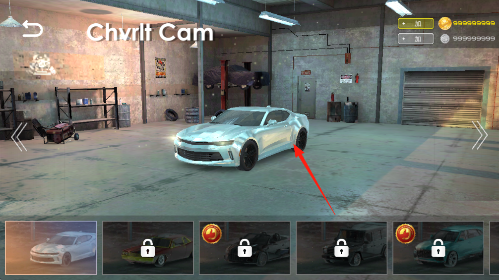 1、在车库界面,点击箭头指向的白色雪佛兰科迈罗(ChvrlltCam),选定要驾驶的车辆。