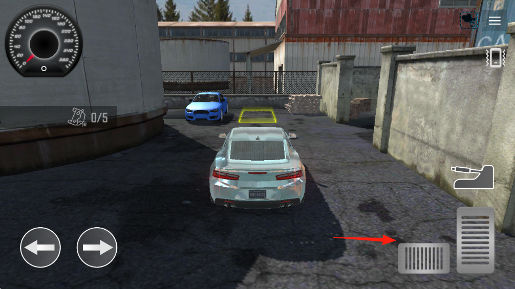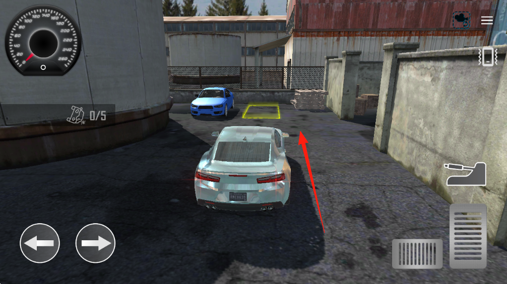 2、进入驾驶场景,操控车辆(箭头指向黄色停车区域),通过左侧方向键、右侧油门(箭头指向)等按键,驾驶汽车前往目标点。