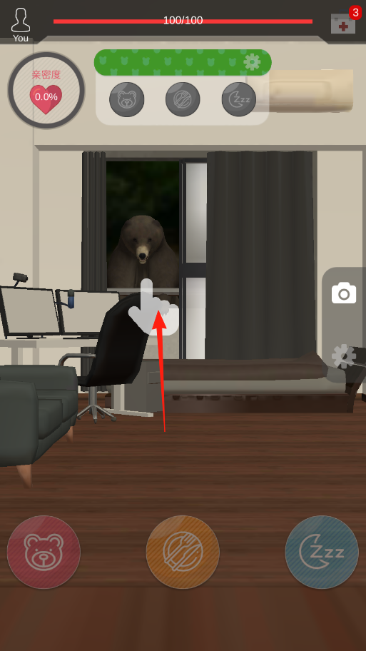 1、在初始房间场景,点击箭头指向的窗户区域,把室外的熊“请”进室内,开启与熊的互动生存流程,此时自身血量为满值100/100。